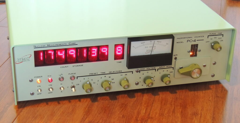 This time I am working on another radiation scaler/counter which is quite a bit different than the last one. This one is a decade newer from 1975 and was built by NMC (Nuclear Measurements Corp.). It has a built-in proportional counter, but has external inputs for Geiger-Mueller, Scintillation, and other sensors.